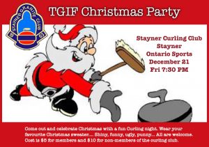 Friday – TGIF Curling & Pizza Night, Stayner Curling Club. Wear your favourite Christmas sweater and celebrate the holidays with